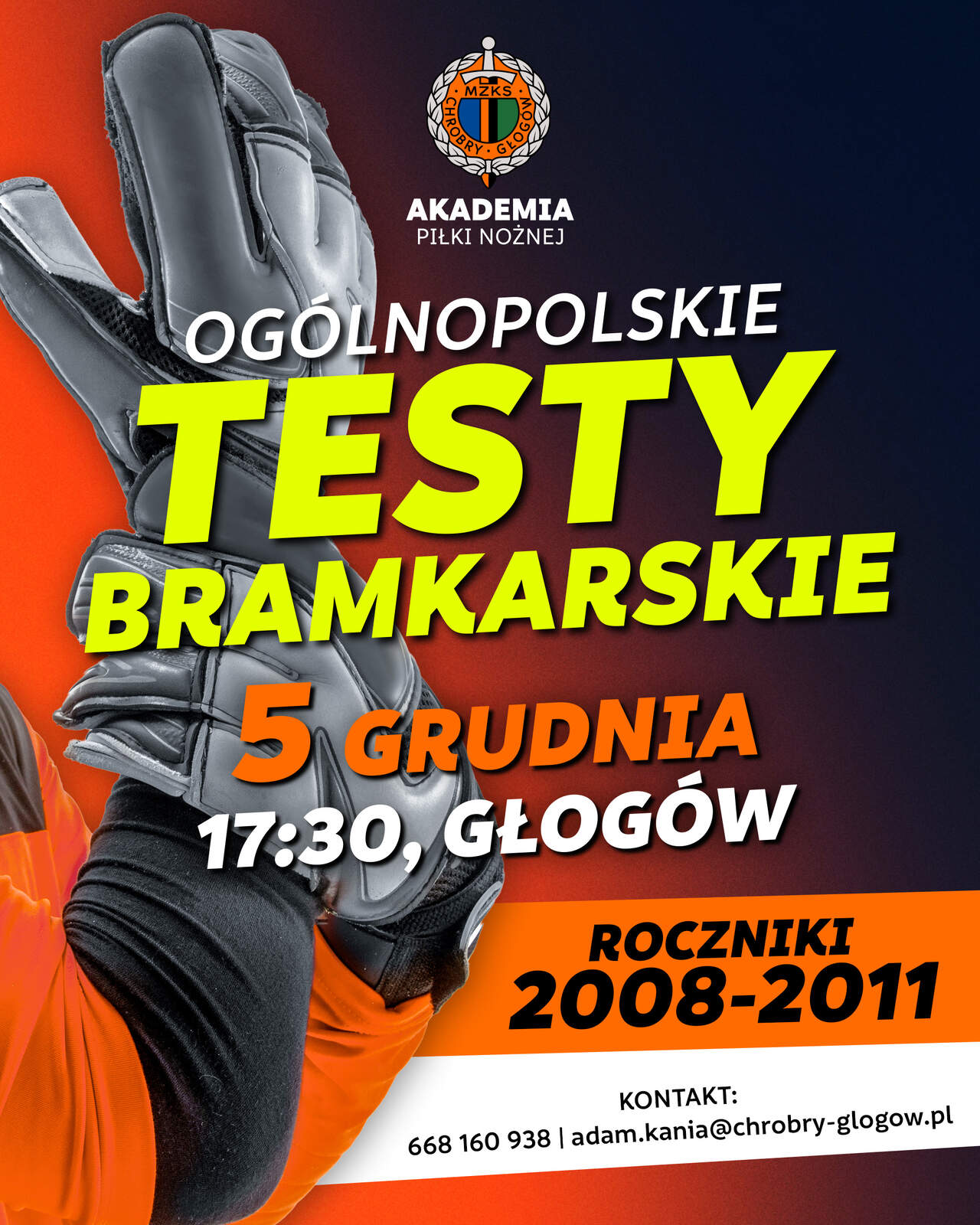 Ogólnopolskie Testy Bramkarskie już 5 grudnia w Głogowie Już 5 grudnia w Akademii Piłki Nożnej Chrobrego Głogów odbędą się ogólnopolskie testy bramkarskie, skierowane do zawodników z roczników 2008–2011. 26-11-2025 07:17 autor: ŁJ To doskonała okazja, aby sprawdzić swoje umiejętności, zdobyć nowe doświadczenie oraz zaprezentować się trenerom jednej z najlepiej broniących drużyn w całej Betclic 1 Lidze. Koordynatorem wydarzenia będzie bowiem trener bramkarzy Chrobrego Głogów Adam Kania, pracujący na co dzień z czołową formacją defensywną w lidze. Szczegóły wydarzenia: Termin: 5 grudnia Godzina: 17:30 Miejsce: Głogów Roczniki: 2008–2011 Jeśli chcesz spróbować swoich sił, rozwijać się i być może dołączyć do jednej z drużyn Akademii, to idealny moment. Do zobaczenia na boisku! Kontakt w sprawie zapisów: 668 160 938 adam.kania@chrobry-glogow.pl