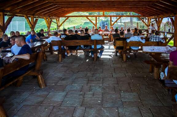 Sportowy Ogródek Grillowy to kameralne miejsce do tego typu spotkań pod zadaszeniem, również późnym wieczorem - przy oświetleniu, charakterystyczny grill i otaczająca wszystko zieleń. A także spokój, bo położony jest w zamkniętej części obiektów. A że stawiamy również na sport, dajemy możliwość korzystania przy tym z placów do gry w siatkówkę czy bule.