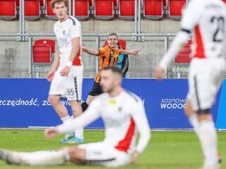 Bardzo, ale to bardzo ważne zwycięstwo! Ależ to jest bardzo ważne zwycięstwo! Chrobry pokonując Zagłębie Sosnowiec 2:1 wygrywa kolejny w tej rundzie mecz „za sześć” i ponownie oddala się od strefy spadkowej. 19-12-2023 06:27 autor: ŁJ Przed tym meczem trener Piotr Plewnia miał sporo przemyśleń, bo sporo problemów kadrowych. Chrobry pojechał do Sosnowca w najtrudniejszej pod tym względem sytuacji w sezonie. Za kartki musieli pauzować Mavroudis Bougaidis, Patryk Mucha i Szymon Bartlewicz, a lista kontuzjowanych bądź chorujących była jeszcze dłuższa (Jakub Kuzdra, Patryk Plewka, Mateusz Machaj, Rafał Wolsztyński, Kamil Wojtyra i Paweł Tupaj). To stworzyło szansę przed kolejnymi młodzieżowcami, bo na Zagłębie pojechali też Adrian Tworzydło z Krzysztofem Janiszewskim i Maciejem Maćkowiakiem. Już w pierwszych minutach niecelnie główkował Mikołaj Lebedyński, ale większy napór był ze strony gospodarzy. W 14 minucie groźnie strzelał Maksymilian Rozwandowicz, lecz został skutecznie przyblokowany. Chrobry, choć bardziej widoczny w defensywie, potrafił odpowiedzieć i wypracować jeszcze lepszą okazję. W 19 minucie przed taką stanął Mateusz Ozimek, po którego uderzeniu piłka przeszła obok słupka. I tak ta połowa minęła. Chrobry miał jeszcze rzut wolny z niecelną próbą Bartosza Biela w 40 minucie, więcej tych strzałów było po stronie sosnowiczan, ale co za tym idzie - więcej niecelnych (tylko raz, w 45 minucie, Dean Guezen przymierzył w światło bramki, z czym Damian Węglarz nie miał kłopotów) - i w efekcie 0:0 po 45 minutach. Trzeba oddać Chrobremu, że skupiając się na obronie nie po raz pierwszy w tym sezonie robił to bardzo dobrze. Do skutecznej obrony trzeba było dorzucić coś z przodu i Chrobry po zmianie stron zaatakował z impetem. W 50 minucie rzut wolny w okolicy narożnika pola karnego wywalczył Mateusz Ozimek i bezpośrednio z tego punktu pokonał bramkarza Zagłębia Mateusza Kosa. 180 sekund później było już 0:2. W jednej akcji dwa razy piłkę wyłuskał Mateusz Ozimek, z prawej strony dograł na środek pola karnego do Mikołaja Lebedyńskiego, skąd piłka trafiła dalej do wolnego Dawida Hanca, który pewnie podwyższył prowadzenie Pomarańczowo-Czarnych. Zagłębie próbowało nadążyć. W 63 minucie po wrzutce z boku nogę dostawiał Tymoteusz Klupś, jednak naciskany przez Michała Michalca nie oddał czystego strzału i futbolówkę pewnie chwycił Damian Węglarz. Poza tym głogowianie opanowali boiskowe wydarzenia i nie dopuszczali do większych spięć pod swoją bramką. Do pewnego momentu. W 86 minucie kontaktowego gola zdobyli miejscowi, a konkretnie Marek Fabry. Zrobiło się więc bardzo gorąc, tym bardziej że po chwili Patryk Caliński trafił w słupek. Uff… Na szczęście Chrobry, jak się okazało, został wytrącony z tego defensywnego rytmu tylko na moment. Na więcej nie pozwolił. Dzięki temu cieszy się z bardzo, ale to bardzo cennego zwycięstwa. Chrobry kończy więc ten trudny rok - zwycięsko i z czteropunktową przewagą nad strefą spadkową, choć w pewnym momencie sam będąc na 18 pozycji tracił tych kilka punktów. Zdołał odwrócić swoje losy i z większym spokojem może udać się na zimową przerwę. Kolejny mecz w lutym. Fot. 400mm.pl