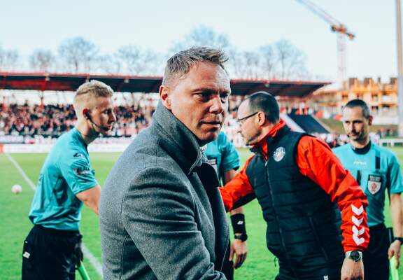 Trenerzy Łukasz Becella i Dawid Szwarga po meczu w Głogowie.
