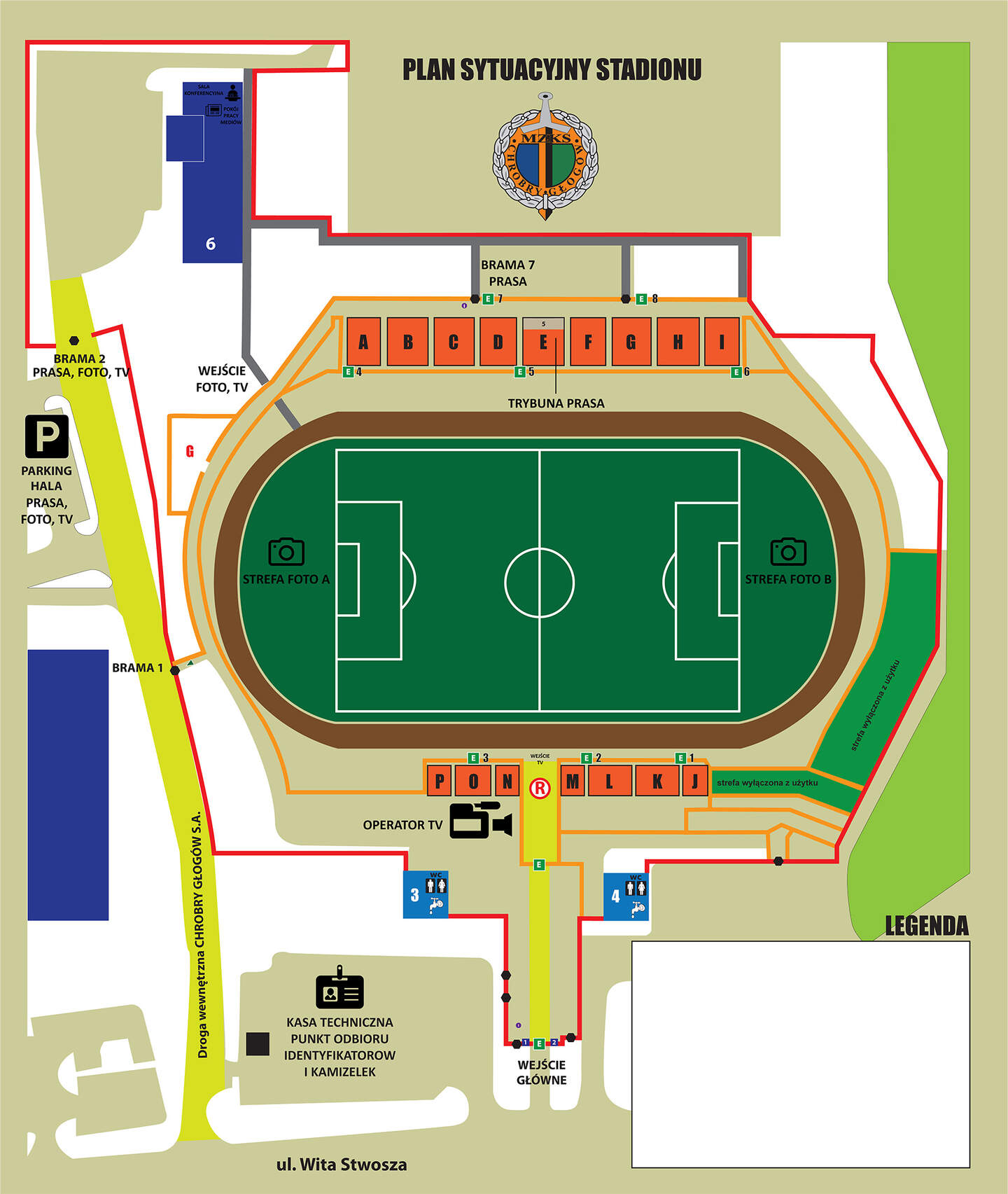 6. Odbioru akredytacji jednorazowej należy dokonać w kasie technicznej przy ul. Wita Stwosza. Strefą pracy mediów na stadionie Chrobrego Głogów są trybuna główna (sektor E) lub strefa murawy. Wejście do tych stref będzie odbywać się bramą główną od strony ul. Wita Stwosza przez kołowrotek nr 8 (trybuna) lub przez budynek klubu i tunel (murawa).