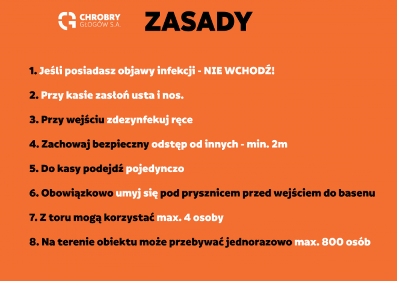Baseny odkryte od 1 lipca W środę, 1 lipca rozpoczyna się sezon na aktywne spędzanie czasu na terenie kompleksu basenów odkrytych Chrobry Głogów S.A.Obiekt będzie czynny codziennie od 10:00 do 20:00.W zakresie przeciwdziałania COVID19 stosujemy… 29-06-2020 04:16 autor: MK W środę, 1 lipca rozpoczyna się sezon na aktywne spędzanie czasu na terenie kompleksu basenów odkrytych Chrobry Głogów S.A.Obiekt będzie czynny codziennie od 10:00 do 20:00.W zakresie przeciwdziałania COVID19 stosujemy następujące zasady:1) maksymalna ilość gości jednocześnie: 800,2) należy zachować dystans 2m od innych osób,3) z jednego toru basenu sportowego może jednocześnie korzystać do 4 osób.4) przy kasie należy zasłonić usta i nos.Zasada dystansu społecznego oraz ograniczenia ilościowe na torze pływackim nie dotyczą rodzin oraz osób wspólnie zamieszkujących w gospodarstwie domowym.Na terenie kompleksu będzie można korzystać z pełnej oferty: basenów, zjeżdżalni, placu zabaw, boisk sportowych i baru.Bilety całodniowe:- normalny - 15zł- ulgowy - 10zł- rodzinny (max. 2+2) - 30zł