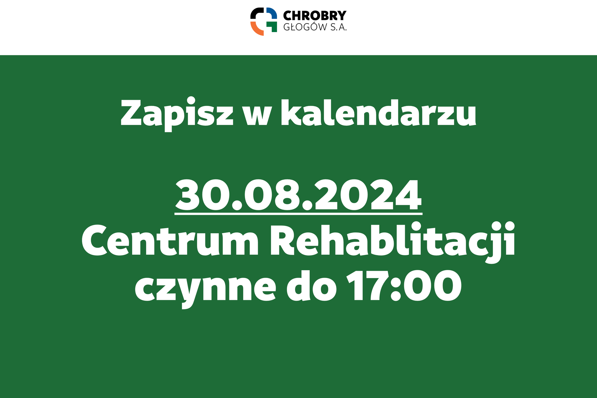 informujemy, że 30 sierpnia (piątek), CENTRUM REHABILITACJI czynne będzie do godziny 17:00.