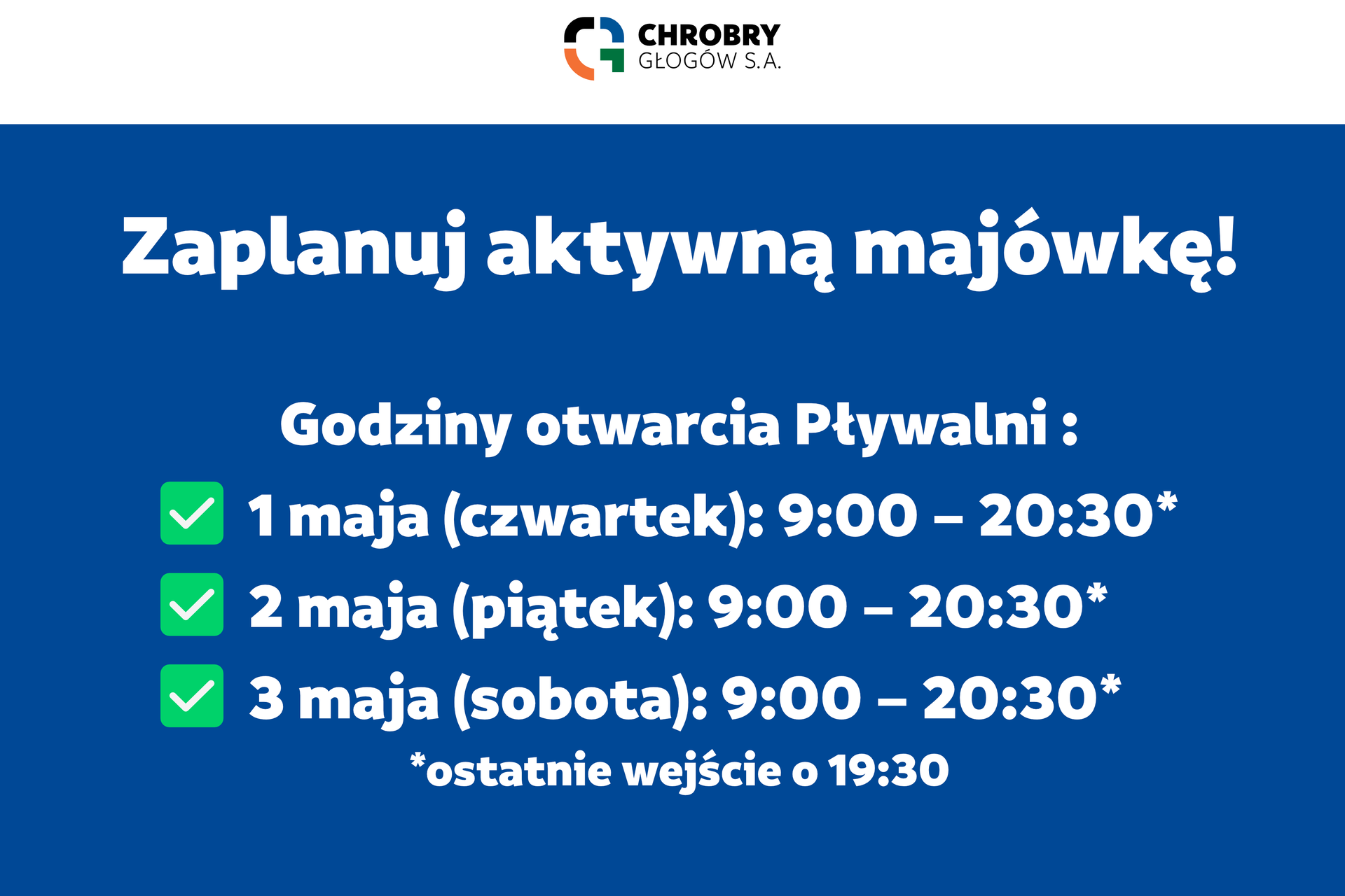 Godziny otwarcia na majówkę 28-04-2025 03:35 autor: 📢 Godziny otwarcia Pływalni Chrobry Głogów w majówkę: ✅ 1 maja (czwartek): 9:00 – 20:30 (ostatnie wejście o 19:30) ✅ 2 maja (piątek): 9:00 – 20:30 (ostatnie wejście o 19:30) ✅ 3 maja (sobota): 9:00 – 20:30 (ostatnie wejście o 19:30) ✅ 4 maja (niedziela): 9:00 – 20:30 (ostatnie wejście o 19:30) Widzimy się na basenie! Zaplanuj aktywną majówkę razem z nami!