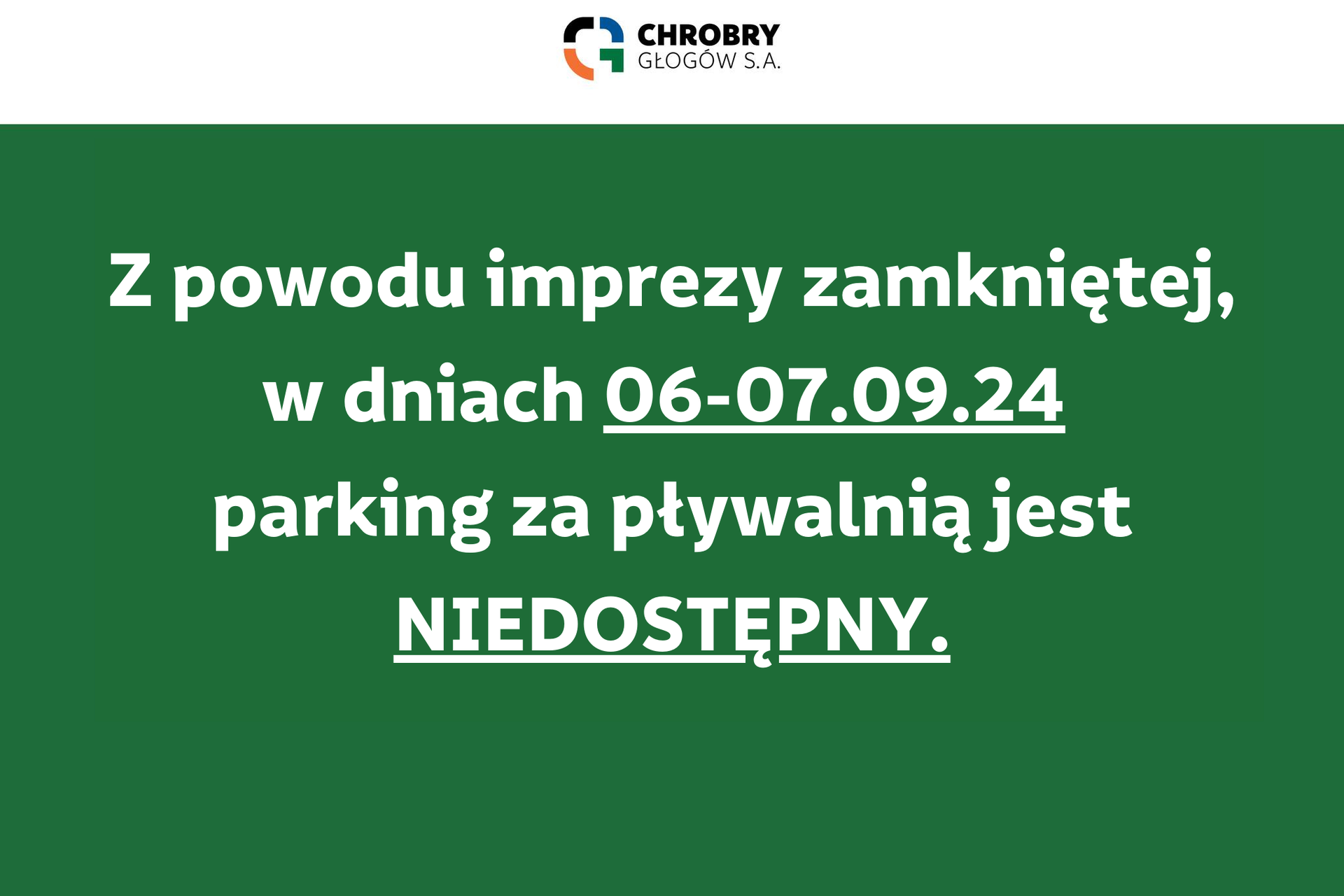 Brak możliwości parkowania za pływalnią Z powodu imprezy zamkniętej parkingi niedostępne dla klientów pływalni 06-09-2024 10:47 autor: Drodzy Klienci, w dniach 06-07.09.2024 parking za pływalnią jest niedostępny z powody imprezy zamkniętej. Za wszelkie neidogodności przepraszamy.