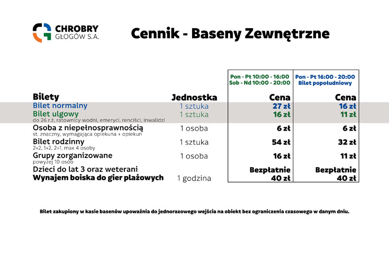Bilet zakupiony w kasie basenów upoważnia do jednorazowego wejścia na obiekt bez ograniczenia czasowego w danym dniu.