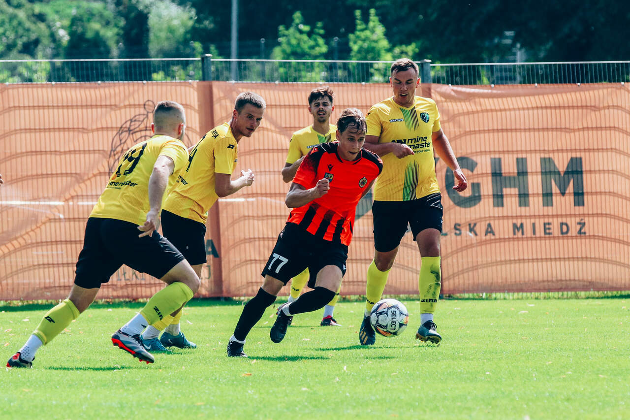 ChG II: pech w doliczonym czasie gry Pech Chrobrego w doliczonym czasie gry. Po bramce zdobytej w ostatnich minutach Górnik Złotoryja wygrał w Głogowie 1:0 w meczu 2. kolejki Koleje Dolnośląskie 4 Ligi. 10-08-2025 01:28 autor: ŁJ Spotkanie było zacięte, choć w pierwszej połowie to Chrobry był bliżej zdobycia gola – dwukrotnie jednak na drodze piłki stanął słupek. W drugiej odsłonie wszystko wskazywało na podział punktów. Nawet w najbardziej groźnych sytuacjach było remisowo. Po stronie Chrobrego swojej okazji nie wykorzystał Miłosz Skowronek, natomiast po drugiej – strzał wychodzącego na czystą pozycję zawodnika Górnika obronił Paweł Lenarcik. W doliczonym czasie gry ogromny pech spotkał gospodarzy. W trakcie interwencji Wiktor Łaszyński niefortunnie skierował piłkę do własnej bramki. Głogowianie grali wówczas w dziesięciu – chwilę po wejściu na boisko kontuzji doznał Adrian Tworzydło i musiał opuścić plac gry, a limit zmian został już wyczerpany. Wcześniej, tuż po rozpoczęciu drugiej połowy, urazu nabawił się też Ziemowit Witczak. Obaj zawodnicy zostali zniesieni z murawy na noszach. Życzymy im szybkiego powrotu do zdrowia, a Chrobremu – szybkiego odbicia po tym pechowym występie. Okazja ku temu nadarzy się w sobotę, 16 sierpnia, kiedy Pomarańczowo-Czarni zagrają na wyjeździe z Łużycami Lubań. CHROBRY II GŁOGÓW – GÓRNIK ZŁOTORYJA 0:1 (0:0) 0:1 Łaszyński 90 (sam.) Chrobry II: Lenarcik – Janik, Szarek (59 Łaszyński), Tworzydło K. (85 Tworzydło A.), Francus (67 Machaj), Janczukowicz (59 Cichy), Antkowiak (46 Wojtal), Bonecki, Kuzdra (59 Skowronek), Malczuk, Witczak (52 Manijak). Żółte kartki (Chrobry II): Machaj, Janik, Francus, Manijak, Skowronek, Cichy.