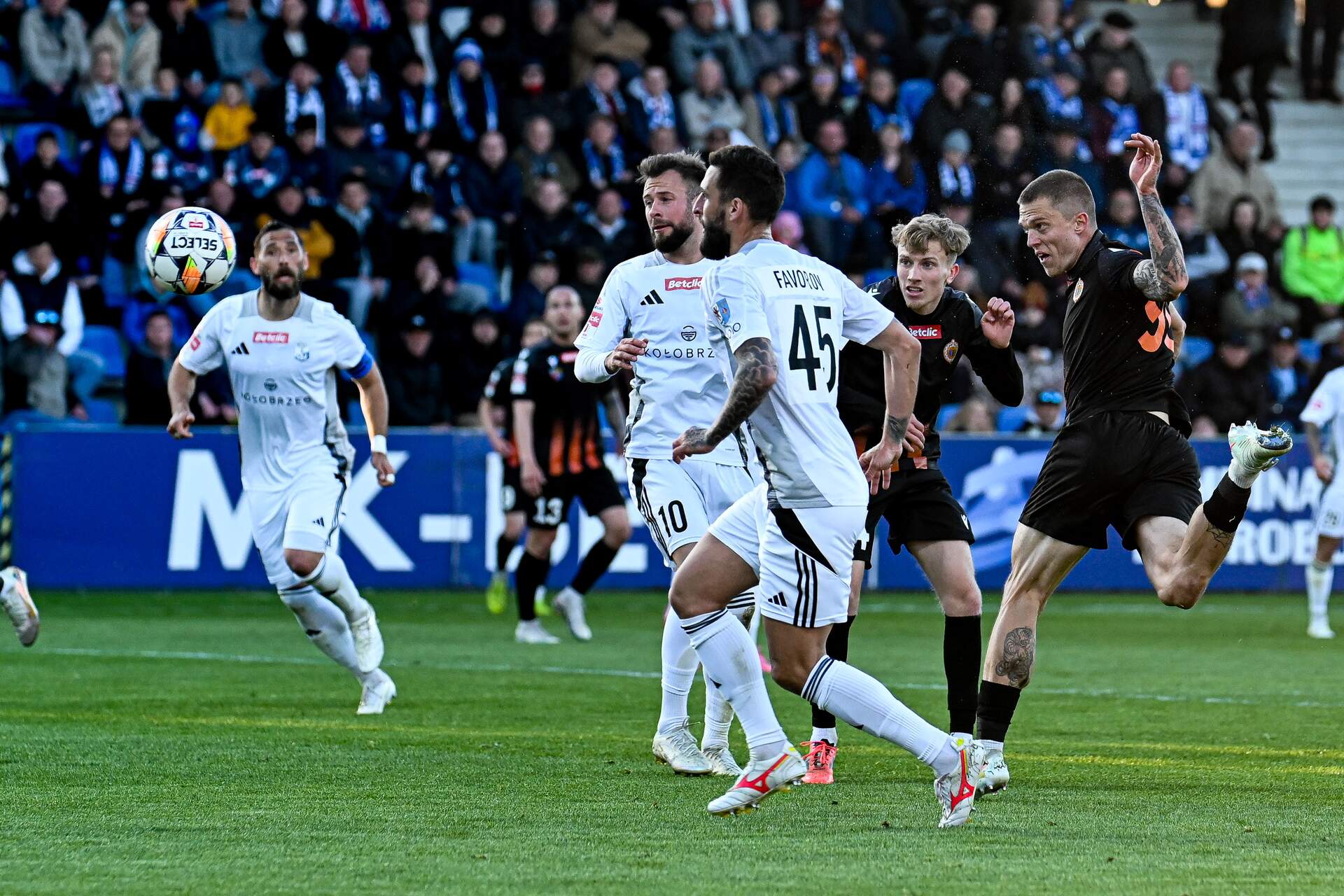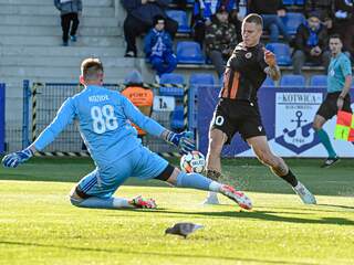 Rewanż Kotwicy za jesień Kolejny raz szalony mecz z Kotwicą. Dwa gole w 90 minucie, ale punkty dla gospodarzy... 05-05-2025 08:50 autor: ŁJ Pierwsi spróbowali gospodarze, ale strzał Miłosza Kurowskiego był niecelny. Takich uderzeń z czasem było więcej, i to po obu stronach, lecz po żadnym piłka nie zmierzała w światło bramki. Po stronie Kotwicy przymierzali Mykola Musolitin i raz jeszcze Kurowski. Groźniejsza była próba głogowian, gdy w 23 minucie Mateusz Ozimek wycofał futbolówkę do Roberta Mandrysza, a pomocnik Chrobrego posłał ją tuż obok słupka. Przy odrobinie szczęścia to mógł być gol. Później w Chrobrym niecelnie główkował Mateusz Lewandowski i wszystko sprowadzało się do tego, że w tej połowie wynik nie ulegnie zmianie. A jednak… W 43 minucie rękę Pawła Antczaka w polu karnym wypatrzył sędzia i podyktował jedenastkę, którą na prowadzenie zamienił Michał Cywiński. fot. 400mm.pl fot. 400mm.pl Druga część zaczęła się od uderzeń po obu stronach. Najgroźniejsze było za sprawą Michała Cywińskiego, bo po tym interweniować musiał Paweł Lenarcik. Jeszcze przed upływem 60 minuty trener Łukasz Becella zareagował i dokonał aż trzech zmian. Boisko opuścili Mandrysz, Antczak i Kuzdra, a ich miejsce zajęli Lebedyński, Bartlewicz oraz Hanc. W 63 minucie niebezpiecznie zza szesnastki przymierzył Joshua Perez i niewiele zabrakło, aby piłka wpadła do środka. Szybko z atakiem ruszył Chrobry, którego akcję kończył Mateusz Ozimek, lecz jego strzał obronił Marek Kozioł. Remis powinien być 10 minut później. Dośrodkował Szymon Bartlewicz, a głową na dalszym słupku zamykał to Myroslav Mazur i tylko świetna interwencja golkipera Kotwicy zapobiegła wyrównaniu stanu meczu. Pomarańczowo-Czarni byli coraz bliżsi, bo chwilę później strzelał jeszcze Szymon Lewkot, co też wymagało reakcji Marka Kozioła. W 88 minucie w ekwilibrystyczny sposób wstrzelić się próbował Myrosław Mazur, jednak futbolówka poszybowała ponad poprzeczką. Te dążenia Chrobrego przyniosły efekt w postaci rzutu karnego już w 90 minucie. Sędzia Damian Kos wrócił do sytuacji, w której za koszulkę ciągnięto Mikołaja Lebedyńskiego i po analizie VAR wskazał na wapno. Do remisu z 11. metra doprowadził Mateusz Lewandowski. Odżyły wtedy wspomnienia z jesieni, kiedy głogowianie zdobywając dwie bramki w 90 minucie wrócili z dalekiej podróży i pokonali Kotwicę 3:2. I właśnie wtedy na jeszcze jedną szarżę zebrali się miejscowi. To po niej Joshua Perez z najbliższej odległości pokonał Pawła Lenarcika i tym wygrał mecz, który chwilę później dobiegł końca… Niebywałe. Dwa pojedynki z Kotwicą, 8 goli, w tym 4 w doliczonym czasie gry, ale na samym finiszu sezonu z takiego obrotu sprawy cieszą się rywale. Chrobry ma trzy punkty przewagi nad strefą spadkową. W kolejnym meczu, jednym z trzech ostatnich, podejmie również walczącą o utrzymanie Wartę Poznań (niedziela, 11 maja, godz. 12.00).