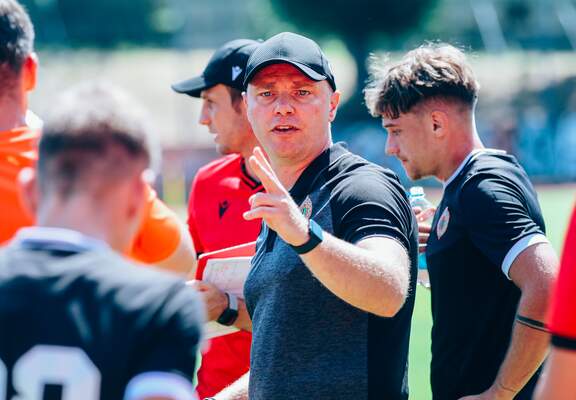 Trener Łukasz Becella po sparingu ze Świtem Szczecin.