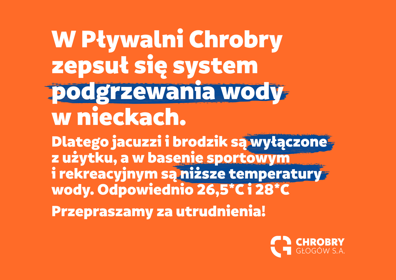 Awaria w Pływalni Chrobry W Pływalni Chrobry zepsuł się system podgrzewania wody. 06-09-2022 07:48 autor: MK / MB / zdjęcia: MS W Pływalni Chrobry zepsuł się system podgrzewania wody. Z tego powodu wyłączone z użytku są jacuzzi i brodzik. Są najmniejsze i najszybciej się wychładzają. W basenie sportowym i rekreacyjnym temperatury wody są niższe niż zwykle. Odpowiednio 26,5*C oraz 28*C. Ustaliliśmy przyczynę awarii i oczekujemy na dostawę części. Możliwe, że w ciągu najbliższych kilku, kilkunastu godzin Pływalnia wróci do normalnej pracy. Przepraszamy za utrudnienia!