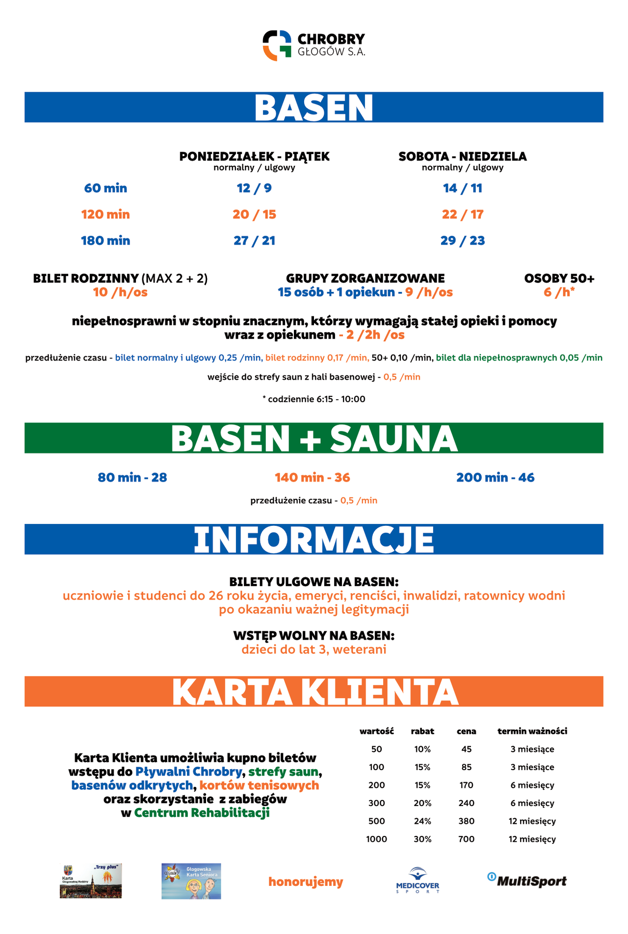 Zmiany w Pływalni Chrobry Od dziś wprowadzamy garść zmian w Pływalni Chrobry. 01-09-2021 12:01 autor: ŁJ Od dziś wprowadzamy garść zmian w Pływalni Chrobry. Od 1.09 Pływalnia jest otwarta od 6:15 do 21:45. Codziennie. Ostatnie wejście do hali basenowej i strefy saun jest o godzinie 20:30. Wyjście z hali i saun o 21:30 O 21:45 zamykamy obiekt. Od dziś obowiązuje nowy cennik Pływalni Chrobry. Wprowadziliśmy trochę uproszczeń, zmian i nowości. Na przykład bilet Basen+Sauna na 200 minut! O wszystkich zmianach dowiesz się w kasach Pływalni.