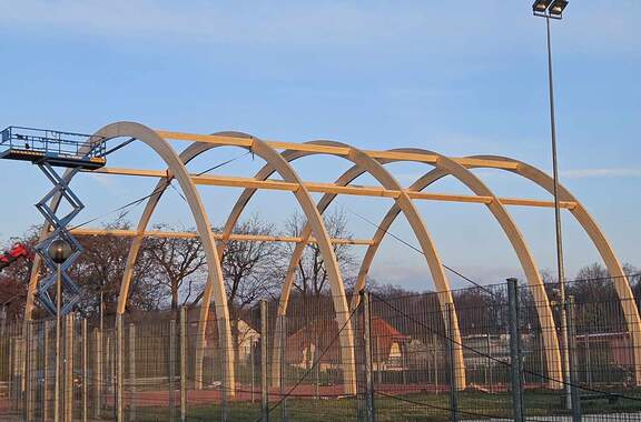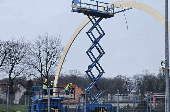 Drewniane dźwigary postawione! Zakończył się 1 etap budowy boiska zadaszonego. 15-03-2024 07:32 autor: MK / MK / zdjęcia: MK/Q Po 3 dniach od startu prac firma Quortex Sp. z o. o. z Gorzowa Wielkopolskiego wykonała pierwszy etap pracy przy "Budowa boiska sportowego o wymiarach 20x40 m z zadaszeniem łukowym z zewnętrzną podziemną instalacją zasilającą". Drewniane dźwigary są osadzone i czekają na nakrycie materiałem PVC. Więcej o inwestycji TUTAJ Zadanie realizowane jest w ramach programu Ministerstwa Sportu i Turystyki "Program Rozwoju Infrastruktury Piłkarskiej edycja 2022" Zadanie dofinansowane w ramach Programu Rozwoju Infrastruktury Piłkarskiej edycja 2022 organizowanego przez Ministerstwo Sportu i Turystyki.