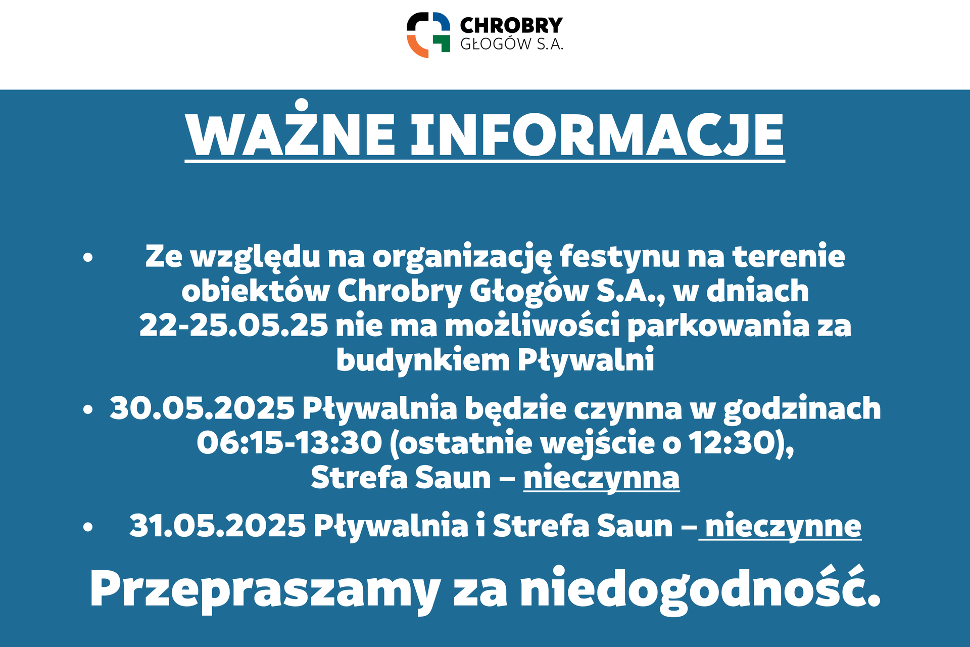 •    Ze względu na organizację festynu na terenie obiektów Chrobry Głogów S.A., w dniach 22-25.05.25 nie ma możliwości parkowania za budynkiem Pływalni